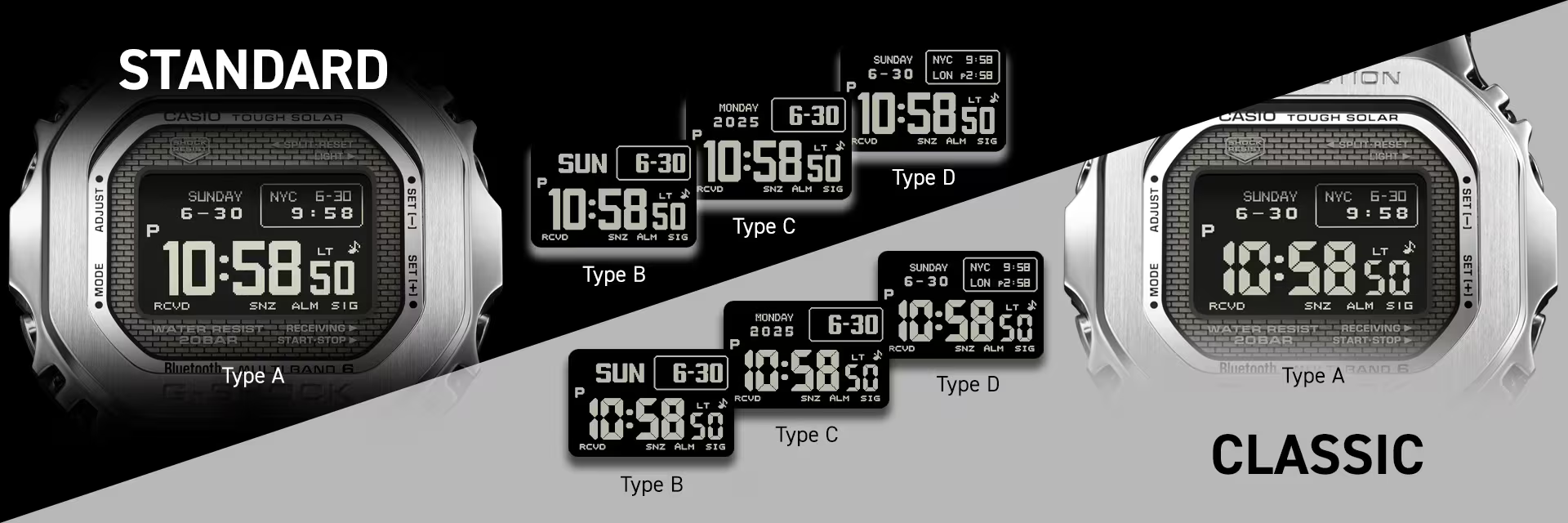 高精細・広視野角・高コントラストを実現したこのMIP液晶は、視認性を飛躍的に高めただけでなく、Bluetooth®によるスマートフォン連携(CASIO WATCHESアプリ)により、メイン表示のフォントをクラシカルな7セグメントフォントに切り替えられるという、時計愛好家の好奇心をくすぐる機能も搭載しています。最新のタフソーラー、マルチバンド6を備えながら、クラシックな表情も楽しめるという、遊び心溢れる設計は、私たち時計愛好家にとってたまりません。